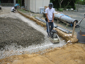 高さをオートレベルで細かく見ながら均し、プレート転圧していきます。